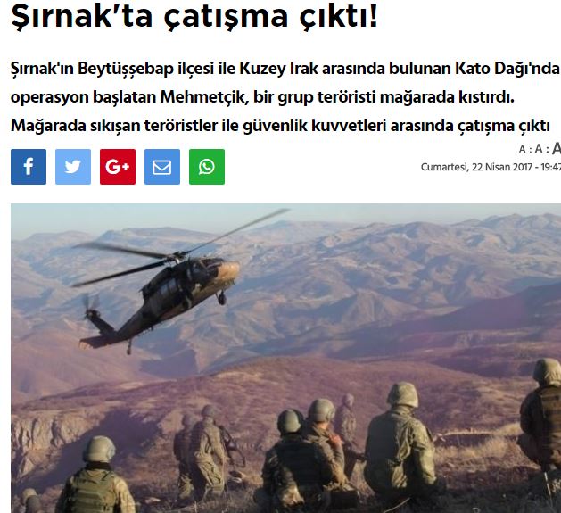 Σε άλλο δημοσίευμα της ίδιας ιστοσελίδας σημειώνεται ότι στην περιοχή Μπεϊτούσεμπαπ στο Σιρνάκ, ομάδα Κούρδων αυτονομιστών επιτέθηκε στις τουρκικές δυνάμεις ασφαλείας όταν παγιδεύτηκε σε σπήλαιο της περιοχής. Δεν αναφέρονται θύματα.