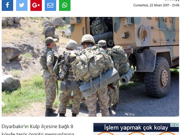Η ίδια πηγή αναφέρει ακόμη ότι σύγκρουση ξέσπασε μεταξύ των τουρκικών δυνάμεων ασφαλείας στην περιοχή Κούλπ του Ντιγιαρμπακίρ, όπου είχε απαγορευθεί κάθε μετακίνηση των κατοίκων σε 8 χωριά. Στη μάχη που ακολούθησε τραυματίσθηκαν τρεις Τούρκοι στρατιώτες.