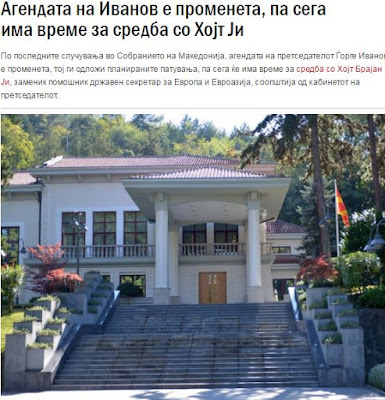 Μετά τις πρόσφατες εξελίξεις στο Κοινοβούλιο των Σκοπίων και την άρνηση της αντιπολίτευσης του SDSM και των αλβανικών κομμάτων να παραστούν σε συνάντηση με τον πρόεδρο των Σκοπίων, ο Γκιόργκε Ιβάνοφ άλλαξε τη στάση του στο προγραμματισμένο ταξίδι του βοηθού Γραμματέα του Στέιτ Ντιπάρτμεντ, Χόιτ Μπράιαν Γι , ανακοίνωσε σήμερα το προεδρικό γραφείο.