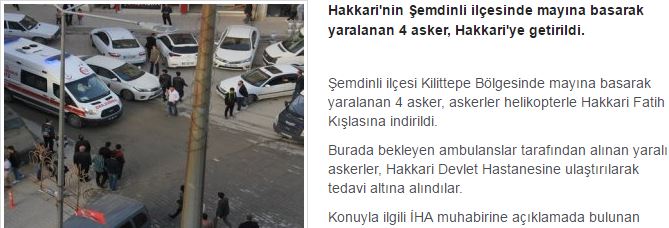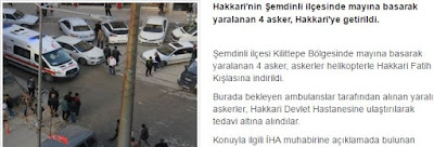 Στρατιωτικό όχημα στην περιοχή Κιλίτ Τεπέ της Σεμντινλί του Χακάρι πάτησε νάρκη που είχε τοποθετηθεί από αυτονομιστές του Εργατικού Κόμματος του Κουρδιστάν (PKK), με αποτέλεσμα να εκτιναχθεί και να τραυματισθούν 4 στρατιώτες, όπως σημειώνει τοπικό δημοσίευμα.