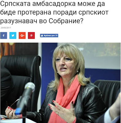 Η επικεφαλής της διπλωματικής αποστολής της Σερβίας στα Σκόπια, πρέσβειρα, Ντουσάνκα Ντίβιακ Τόμιτς, κλήθηκε σήμερα από το Υπουργείο Εξωτερικών των Σκοπίων να απαντήσει στο ερώτημα γιατί βρισκόταν ο Σέρβος αξιωματούχος των μυστικών υπηρεσιών, Γκόραν Ζιβαλιέφιτς, στο Κοινοβούλιο κατά τη διάρκεια των γεγονότων της 27ης Απριλίου.