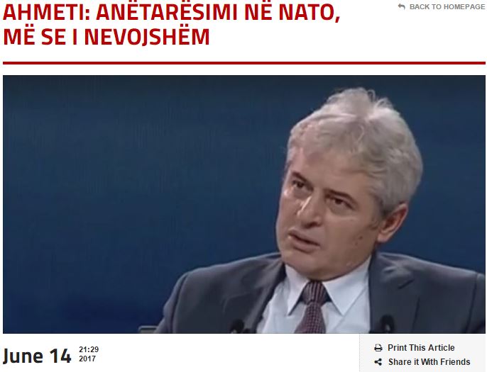 “Η άμεση ένταξη στο ΝΑΤΟ καθίσταται περισσότερο από αναγκαία και το DUI θα κάνει το καλύτερο δυνατόν για να επιτευχθεί αυτός ο στόχος. Κάθε καθυστέρηση σε αυτήν την πορεία αφήνει χώρο για εισδοχή ξένων ιδεολογιών για γεωπολιτική και γεωστρατηγική σύγκρουση», τόνισε ο Αχμέτι κατά τη συνάντηση.
