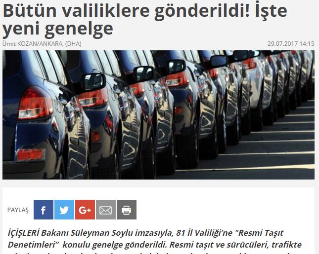 Ο υπουργός Εσωτερικών, Σουλεϊμάν Σόιλου, υπέγραψε εγκύκλιο σχετικά με τη ‘διακίνηση οχημάτων του δημοσίου’ στις 81 επαρχίες της επικράτειας, τη οποία οφείλουν να εφαρμόσουν οι τοπικές κυβερνήσεις.