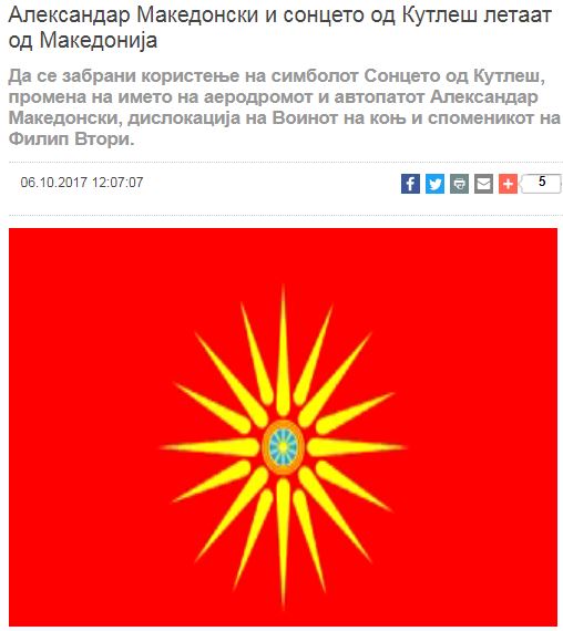 «Να απαγορευθεί η χρήση του συμβόλου του Ήλιου της Βεργίνας, να μετονομασθεί το αεροδρόμιο και ο αυτοκινητόδρομος ‘Μέγας Αλέξανδρος’, να ξηλωθεί το άγαλμα του έφιππου πολεμιστή και το άγαλμα του Φίλιππου του Β’ από το κέντρο των Σκοπίων. Οι Έλληνες ιστορικοί θα διαγράψουν και θα αναθεωρήσουν την ιστορία».