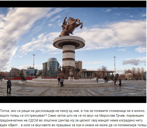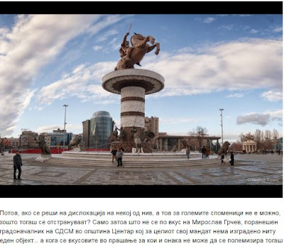 Η εφημερίδα σημειώνει ότι πρόκειται για μνημεία που τονίζουν την εθνική ταυτότητα των (ψευδο)Μακεδόνων, για τα οποία αποφασίστηκε με χρήματα από τον προϋπολογισμό η ανέγερσή τους, μνημεία για οποία ο Σοσιαλδημοκράτης πρώην δήμαρχος του Κέντρου των Σκοπίων, Μίροσλαβ Γκάρτσεφ αμφισβητεί το συμβολισμό τους.