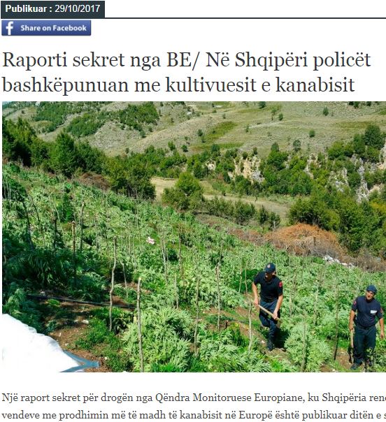 Μυστική έκθεση για τα ναρκωτικά από το Ευρωπαϊκό Παρατηρητήριο, κατατάσσει την Αλβανία ως μια από τις χώρες με τη μεγαλύτερη παραγωγή κάνναβης στην Ευρώπη, δημοσιεύθηκε σήμερα από την «ABC News», γράφει Gazeta Shqiptare.