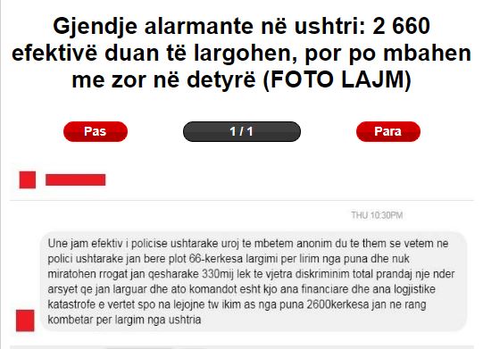 «Υπηρετώ στη Στρατιωτική Αστυνομία, θέλω να μείνω στην ανωνυμία, θα σας πω ότι 66 Στρατιωτικοί Αστυνομικοί ζητούν απόλυση και δεν τους εγκρίνεται. Οι μισθοί είναι γελοίοι, 330 χιλιάδες λέκ το χρόνο (€ 2247)».