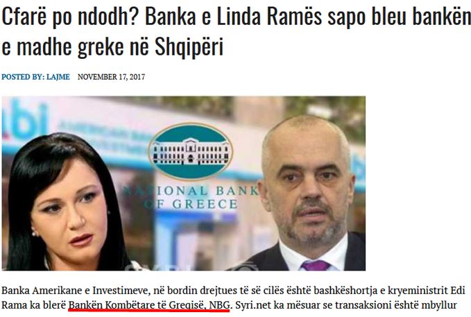 «Τι συμβαίνει; Η Τράπεζα της Λίντας Ράμα, μόλις αγόρασε τη μεγάλη ελληνική τράπεζα στην Αλβανία»