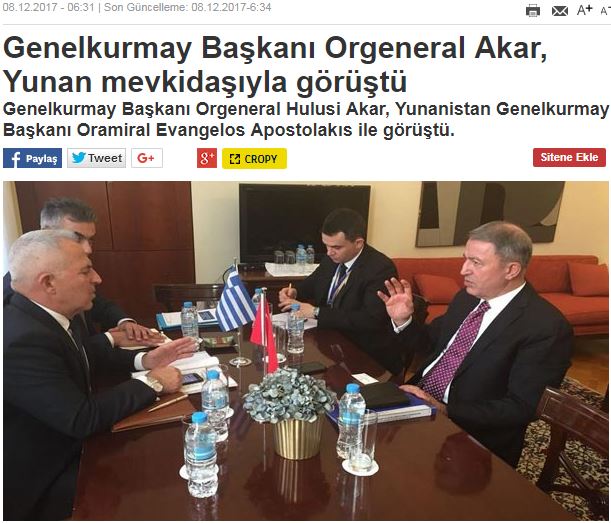 Ο αρχηγός του τουρκικού Γενικού Επιτελείου, στρατηγός Χουλούσι Ακάρ συναντήθηκε με τον Έλληνα αρχηγό του Γενικού Επιτελείου Ευάγγελο Αποστολάκη, σημειώνει η τουρκική εφημερίδα Μιλιέτ.