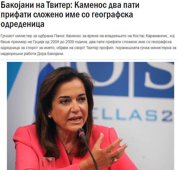 αποδέχθηκε ένα σύνθετο όνομα με γεωγραφικό προσδιορισμό για το ζήτημα της ονομασίας των Σκοπίων», ανέφερε στο λογαριασμό της στο Twitter η πρώην υπουργός Εξωτερικών της Ελλάδας, Ντόρα Μπακογιάννη.