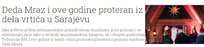 Έτσι, στο Σαράγεβο που πλειοψηφούν οι Μουσουλμάνοι, όπως και σε άλλες πόλεις της Ομοσπονδίας Βοσνίας- Ερζεγοβίνης, φέτος ορισμένα νηπιαγωγεία δεν δέχθηκαν να στολίσουν με τα ‘πλανητικά γνωστά μασκότ του Άγιου Βασίλη».