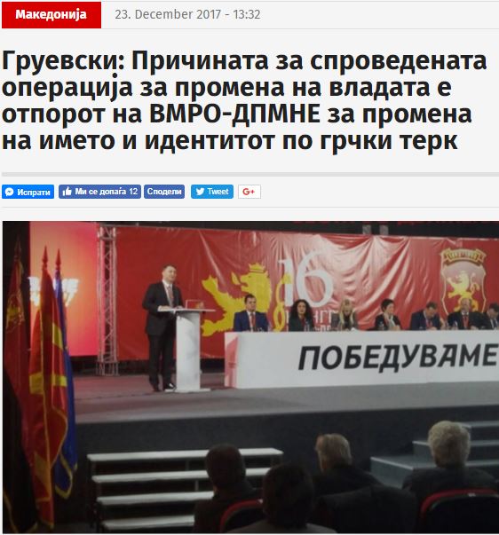 «Στην πραγματικότητα, ο λόγος για την αλλαγή της εξουσίας είναι ακριβώς αυτός: η αντίσταση του VMRO-DPMNE στις εμμονές του νότιου γείτονα να αλλαχθεί το όνομα και η ταυτότητα, προκειμένου να εξαλειφθεί το εμπόδιο για την ταχύτερη