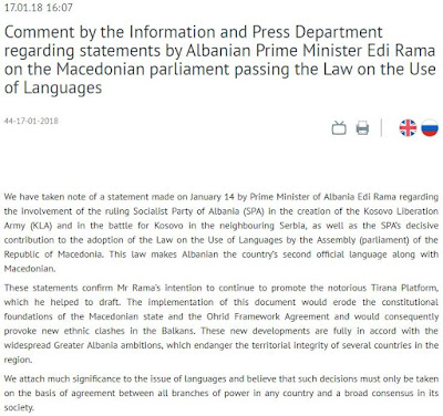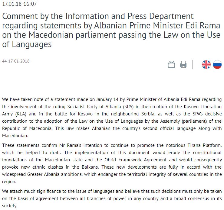 Στο ρωσικό κείμενο τονίζεται ότι οι παρεμβάσεις του Αλβανού πρωθυπουργού, Έντι Ράμα με την περιβόητη Πλατφόρμα των Τιράνων, στο σχεδιασμό της οποίας βοήθησε, έχουν ως σκοπό τη διάβρωση των συνταγματικών θεμελίων του «(Ψευδο)μακεδονικού» κράτους και της συμφωνίας- πλαισίου της Οχρίδας, η οποία διάβρωση θα προκαλέσει νέες εθνοτικές συγκρούσεις στα Βαλκάνια.