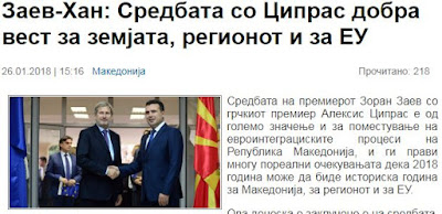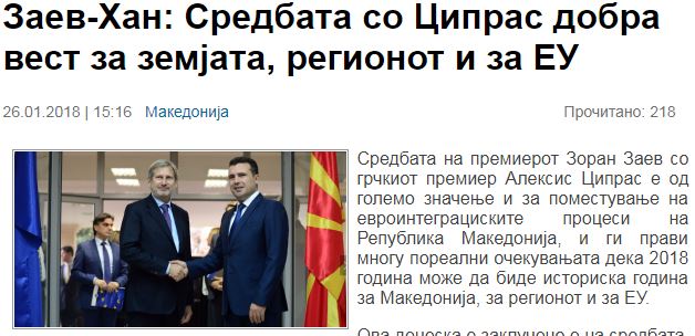 Η συνάντηση του πρωθυπουργού Ζόραν Ζάεφ με τον Έλληνα πρωθυπουργό Αλέξη Τσίπρα έχει μεγάλη σημασία για τη μετακίνηση των ευρωπαϊκών διαδικασιών ολοκλήρωσης στα Σκόπια, αφού κάνει πολύ ρεαλιστικές τις προσδοκίες ότι το 2018 θα μπορούσε να είναι μια ιστορική χρονιά για τη χώρα, την περιοχή και την ΕΕ.