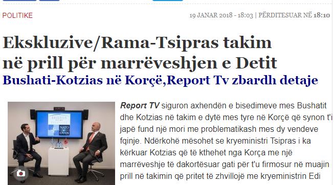 Σύμφωνα εξάλλου, με πληροφορίες από την αλβανική Report TV ο πρωθυπουργός της Ελλάδας, Αλέξης Τσίπρας, ζήτησε από τον Κοτζιά να επιστρέψει από την Κορυτσά με συμφωνία που θα είναι έτοιμη για υπογραφή τον Απρίλιο στη συνεδρίαση που αναμένεται να πραγματοποιηθεί με τον ομόλογό του Έντι Ράμα.