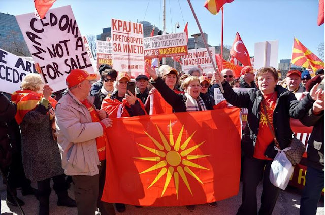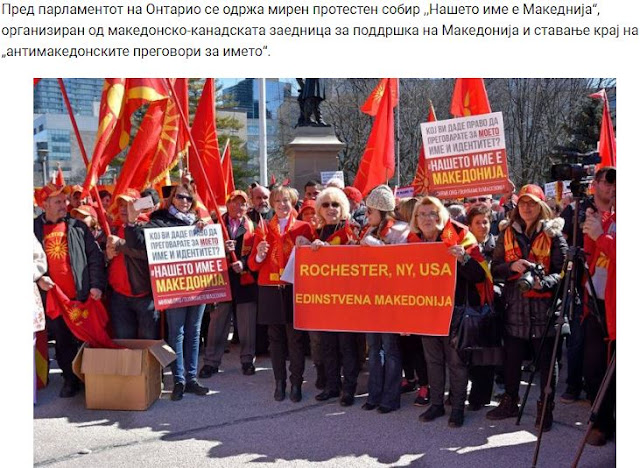 Έξω από το κοινοβούλιο του Οντάριο, πραγματοποίησαν ειρηνική συγκέντρωση διαμαρτυρίας η σλαβική κοινότητα των Σκοπίων για την υποστήριξη της κατοχής του ονόματος «Μακεδονία» για το κράτος των Σκοπίων και συγχρόνως ζήτησαν τη διακοπή των συνομιλιών για το όνομα με την Ελλάδα.