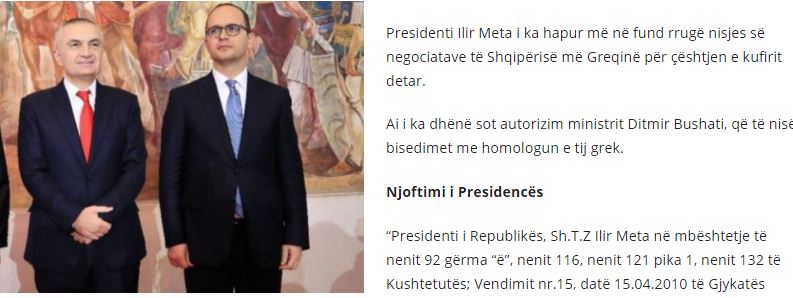 «Μετά από αίτημα του υπουργείου Εξωτερικών και Ευρωπαϊκών Υποθέσεων, εξουσιοδότησε τον Υπουργό κ. Ντιτμίρ Μπουσάτι, επικεφαλής της Διαπραγματευτικής Ομάδας της Δημοκρατίας της Αλβανίας στη διαπραγμάτευση «σχεδίου συμφωνίας μεταξύ της Δημοκρατίας της Αλβανίας και της Δημοκρατίας της Ελλάδας για τον καθορισμό των θαλάσσιων ζωνών τους», αναφέρει μεταξύ άλλων η προεδρία.