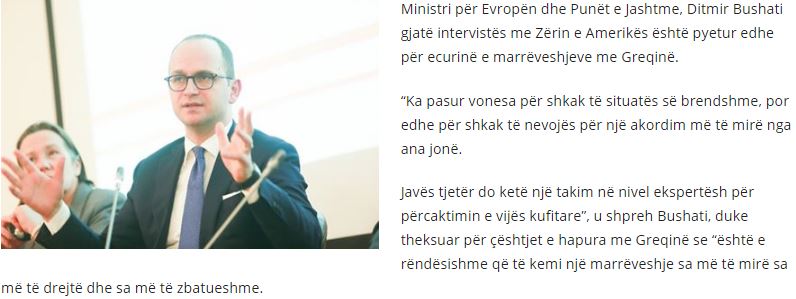 Ο υπουργός Εξωτερικών της Αλβανίας, Ντιτμίρ Μπουσάτι, κατά τη διάρκεια συνέντευξής του στη Φωνή της Αμερικής, αναφέρθηκε στην πρόοδο των συζητήσεων με την Ελλάδα.