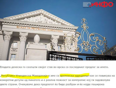 «Η Δημοκρατία της Μακεδονίας της Ίλιντεν» έχει χρονικό καθορισμό, προσδιορίζοντας συγκεκριμένες ημερομηνίες στο παρελθόν και δίνει μια πραγματική δυνατότητα για μια συμβιβαστική λύση που να ικανοποιεί και τις δύο πλευρές. Περιμένουμε ότι η πρόταση αυτή θα γίνει κατανοητή και θα βρει ευρύτερη υποστήριξη στην Αθήνα», ανέφερε η κυβέρνηση.
