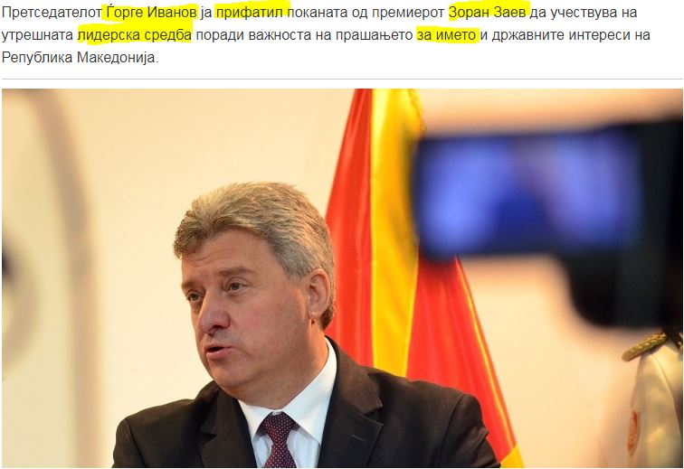 Ο πρόεδρος των Σκοπίων, Γκιόργκε Ιβάνοφ αποδέχθηκε την πρόσκληση του πρωθυπουργού Ζόραν Ζάεφ να συμμετάσχει στην αυριανή συνάντηση των πολιτικών αρχηγών, λόγω της σπουδαιότητας του ζητήματος της ονομασίας και των κρατικών συμφερόντων της Δημοκρατίας.