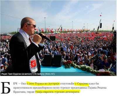 Περίπου δύο χιλιάδες Τούρκοι από την Αυστρία θα μεταβούν στο Σαράγεβο για να παρευρεθούν στην προεκλογική συγκέντρωση του Τούρκου προέδρου, Ρετζέπ Ταγίπ Ερντογάν, σύμφωνα με την Ένωση Ευρωπαίων-Τούρκων Δημοκρατών.