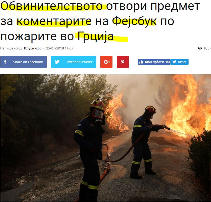 «Η Εισαγγελία των Σκοπίων μετά από τις διαδόσεις ορισμένων άρθρων και σχολίων στα κοινωνικά δίκτυα κατά των Ελλήνων με ρατσιστικά και ξενοφοβικά συνθήματα που σχετίζονται με την πυρκαγιά κοντά στην Αθήνα, όπου υπάρχουν δεκάδες ανθρώπινα θύματα, ξεκίνησε διαδικασία έρευνας», όπως επισημαίνεται στο σλαβικό των Σκοπίων ‘Plus Info’.