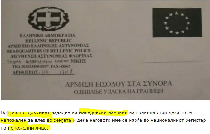 «Σε ελληνικό έγγραφο που εκδόθηκε για ‘Μακεδόνα’ επιστήμονα στα σύνορα, λέει ότι είναι ανεπιθύμητος να εισέλθει στη χώρα και ότι το όνομά του βρίσκεται στο εθνικό μητρώο ανεπιθύμητων προσώπων», γράφει σλαβικό δημοσίευμα των Σκοπίων.