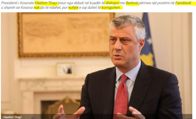 Ο πρόεδρος του Κοσσυφοπεδίου, Χασίμ Θάτσι, αναφερόμενος στη συζήτηση που γίνεται στο πλαίσιο του διαλόγου με τη Σερβία, έγραψε στη σελίδα του στο Facebook ότι το Κοσσυφοπέδιο δεν θα διαιρεθεί, αλλά σίγουρα τα σύνορά του θα πρέπει να διορθωθούν.