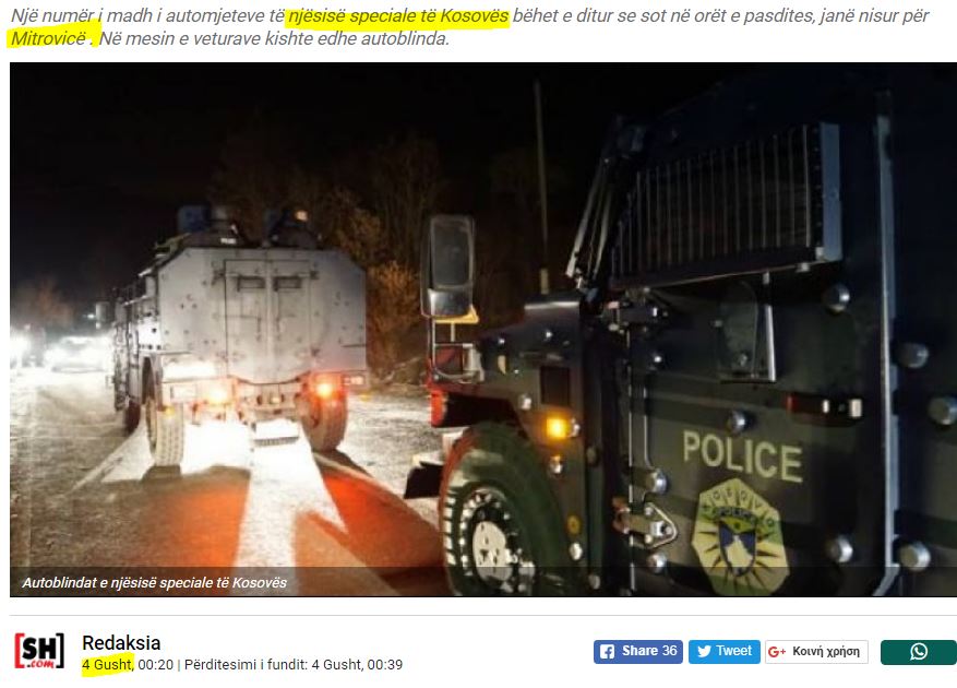 Μεγάλος αριθμός οχημάτων της ειδικής μονάδας του Κοσσυφοπεδίου μετακινήθηκε αργά χθες το απόγευμα προς τη Κοσόβσκα Μιτρόβιτσα.