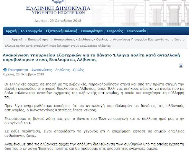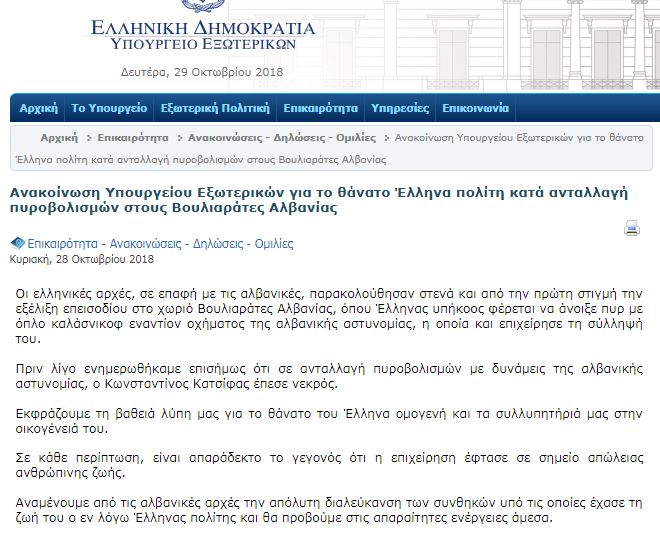 Το υπουργείο Ευρωπαϊκών και Εξωτερικών Υποθέσεων της Δημοκρατίας της Αλβανίας, για το περιστατικό που συνέβη σήμερα (χθες) στους Βουλιαράτες του Αργυροκάστρου, όπου έχασε τη ζωή του ο πολίτης Κωνσταντίνος Κατσίφας, εκφράζει τη λύπη του για την αδικαιολόγητη πολιτικοποίηση της εκδήλωσης στη γειτονική χώρα.