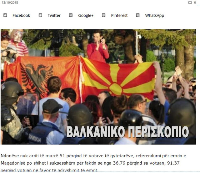 «Αν και απέτυχε να λάβει το 51% των ψήφων των εγγεγραμμένων πολιτών, το δημοψήφισμα για το όνομα της πΓΔΜ φαίνεται επιτυχημένο αφού συμμετείχε σε αυτό το 36,7% και από αυτούς το 91,37 ψήφισε υπέρ της αλλαγής του ονόματος», γράφει αλβανικό δημοσίευμα των Σκοπίων.