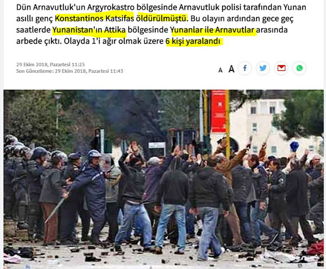 «Στην περιοχή του Αργυροκάστρου της Αλβανίας, χθες, ο νέος άνδρας Κωνσταντίνος Κατσίφας, ελληνικής καταγωγής, σκοτώθηκε από την αλβανική αστυνομία», γράφουν τα τουρκικά μέσα ενημέρωσης.