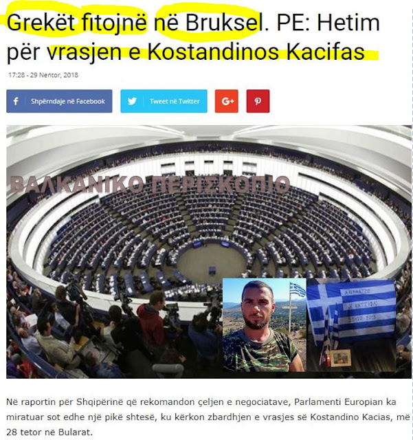 Στην έκθεση της Αλβανίας που συνιστά την έναρξη των ενταξιακών διαπραγματεύσεων, το Ευρωπαϊκό Κοινοβούλιο ενέκρινε σήμερα ένα ακόμη σημείο, με το οποίο απαιτείται η πλήρης διαλεύκανση της δολοφονίας του Κωνσταντίνου Κατσίφα στις 28 Οκτωβρίου στους Βουλιαράτες, γράφει το αλβανικό δημοσίευμα.