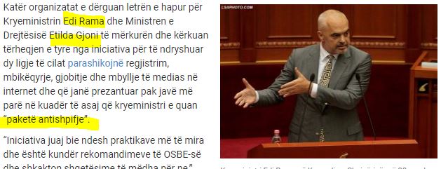 Ανοικτή επιστολή έστειλαν τέσσερις διεθνείς οργανισμοί που υπερασπίζονται την ελευθερία της έκφρασης- η Ευρωπαϊκή Ομοσπονδία Δημοσιογράφων, το Ευρωπαϊκό Κέντρο Μέσων Ενημέρωσης και Τύπου, η PEN International και οι Δημοσιογράφοι Χωρίς Σύνορα, επικρίνοντας 2 νομοσχέδια της αλβανικής κυβέρνησης για «πειθαρχία» των online μέσων ενημέρωσης και ζητούν την απόσυρσή τους, γράφει αλβανικό δημοσίευμα.