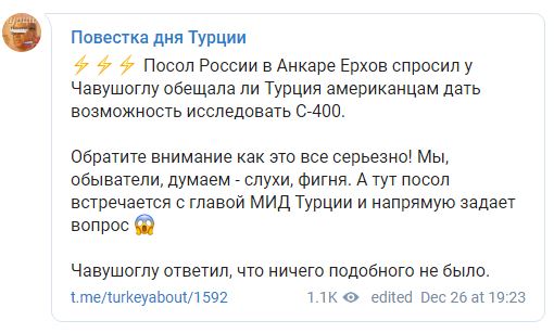Ο πρέσβης της Ρωσίας στην Άγκυρα, Αλεξέι Ερχόφ, ζήτησε -μέσω της διπλωματικής οδού- από τον υπουργό Εξωτερικών της Ρωσίας, Μεβλούτ Τσαβούσογλου, να πληροφορηθεί εάν η Τουρκία υποσχέθηκε στους Αμερικανούς να δώσουν την ευκαιρία να διερευνήσουν- τεχνολογικά και κατασκευαστικά- το ρωσικό αντιπυραυλικό σύστημα C-400.