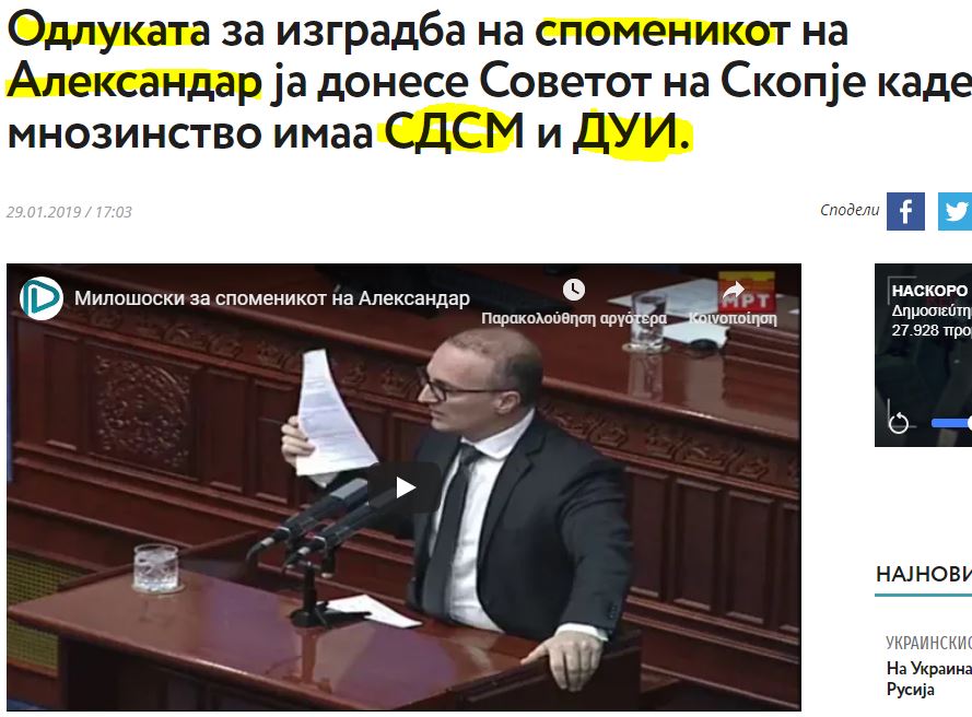 Ο Αντόνιο Μιλόσοσκι, πρώην υπουργός Εξωτερικών και νυν βουλευτής του κόμματος της αντιπολίτευσης VMRO-DPMNE, υπενθύμισε από το βήμα του Κοινοβουλίου ότι η απόφαση για την τοποθέτηση του αγάλματος του Μεγάλου Αλεξάνδρου στο κέντρο της πρωτεύουσας, ήταν του Σοσιαλδημοκρατικού Κόμματος – SDSM και του αλβανικού DUI, τα οποία σήμερα συγκυβερνούν.