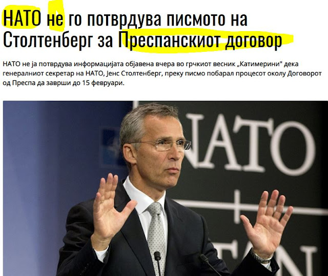 Το ΝΑΤΟ δεν επιβεβαίωσε τις πληροφορίες που δημοσιεύθηκαν χθες, ότι η Γενικός Γραμματέας του ΝΑΤΟ, Γενς Στόλτενμπεργκ ζήτησε να περατωθεί η διαδικασία της Συμφωνίας των Πρεσπών από Σκόπια και Αθήνα μέχρι τις 15 Φεβρουαρίου, σημειώνει το Κανάλ 5 των Σκοπίων.