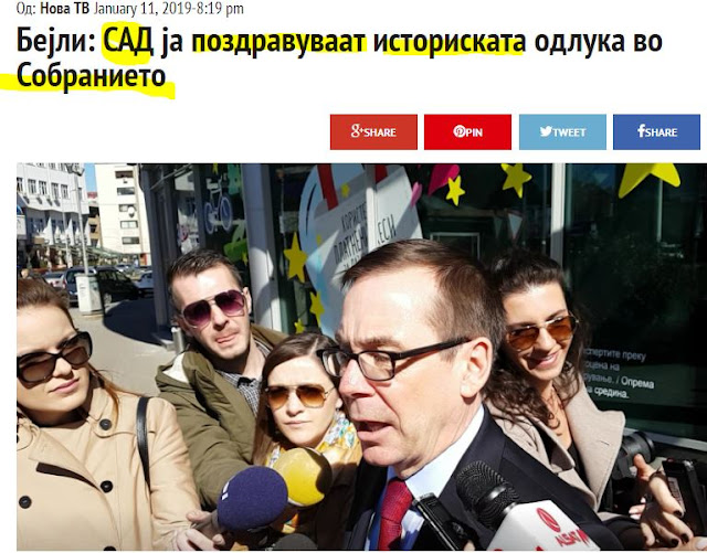 «Η ‘Μακεδονία’ έχει λάβει μια ιστορική απόφαση. Η Συνέλευσή σας ψήφισε και ενέκρινε τις συνταγματικές τροποποιήσεις που απαιτούνται για την εφαρμογή της Συνθήκης των Πρεσπών με την Ελλάδα. Οι Ηνωμένες Πολιτείες χαιρετίζουν την απόφαση των εκλεγμένων αντιπροσώπων σας», δήλωσε ο πρέσβης Τζες Μπέιλι την Παρασκευή το βράδυ αναφερόμενος στις συνταγματικές αλλαγές στο Κοινοβούλιο, σημειώνει το σλαβικό δημοσίευμα.