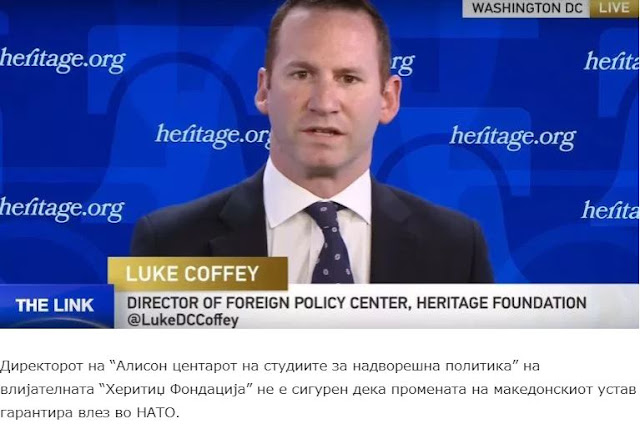 Ο Λούκι Κόφι ( Luke Coffey) διευθυντής του ‘Κέντρου Μελετών Εξωτερικής Πολιτικής Άλισον’ του επιφανούς «Ιδρύματος Κληρονομιάς» (Heritage Foundation) δεν είναι βέβαιος ότι η αλλαγή του ονόματος εγγυάται την ένταξη στο ΝΑΤΟ.