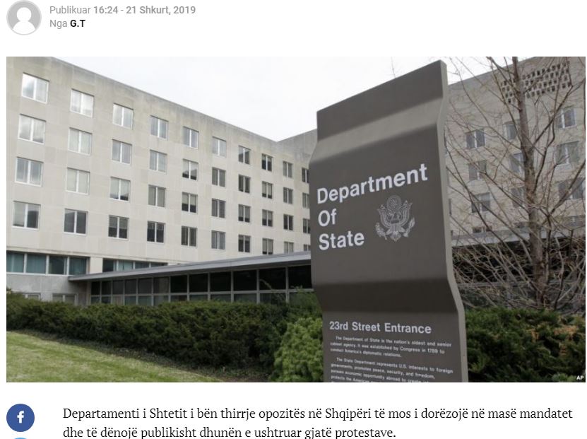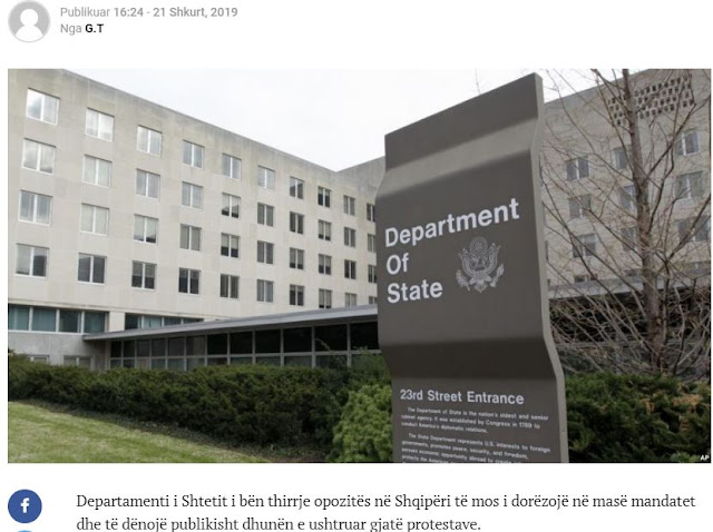 Το Στέιτ Ντιπάρτμεντ καλεί την αντιπολίτευση στην Αλβανία να μην παραδώσει τις εντολές της, αλλά, να καταδικάσει δημόσια τη βία που ασκήθηκε κατά τη διάρκεια των διαμαρτυριών.