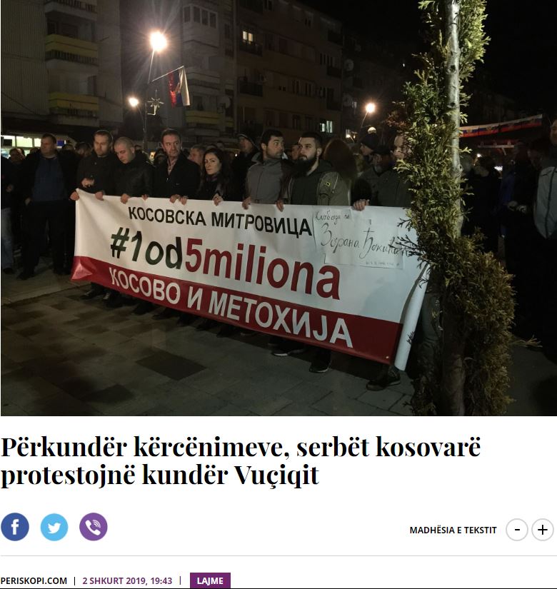 Δεκάδες Σέρβοι, ως επί το πλείστον νέοι άνθρωποι, μεταξύ των οποίων και το πρώην μέλος του κοινοβουλίου του Κοσσυφοπεδίου, Ράντα Τραΐκοβιτς, διαμαρτυρήθηκαν απόψε στο βόρειο τμήμα της πόλης Μιτρόβιτσα του Κοσόβου με το σύνθημα «1 στα 5 εκατομμύρια» κατά της πολιτικής βίας, των δολοφονιών, των απειλών και άλλων παρόμοιων ενεργειών, γράφει το αλβανικό δημοσίευμα.