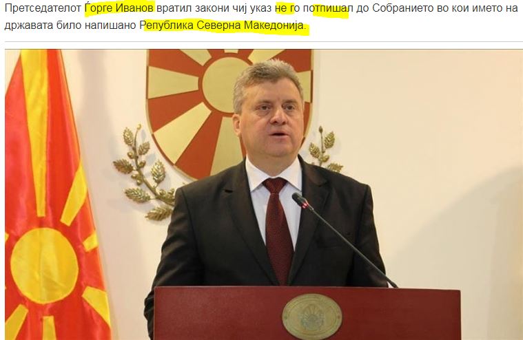 Ο πρόεδρος των Σκοπίων Γκιόργκε Ιβάνοφ δεν υπογράφει διατάγματα τα οποία εγκρίθηκαν από το κοινοβούλιο, αναφέρει το τοπικό σλαβικό ‘mkd’, το οποίο αναφέρει επιγραμματικά τους νόμους που ψηφίστηκαν, μετά την αποδοχή του νέου ονόματος της χώρας.