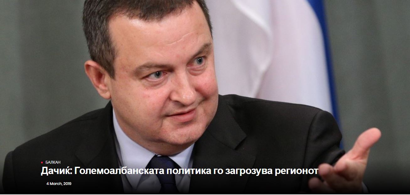 Αν συνεχίσουμε να κλείνουμε τα μάτια μας στη δημιουργία της Μεγάλης Αλβανίας, μπορεί να οδηγηθούμε σε απειλές για την ειρήνη και τη σταθερότητα στην περιοχή, προειδοποίησε ο Ντάτσιτς μιλώντας στο σερβικό πρακτορείο ειδήσεων Τανγιούγκ.