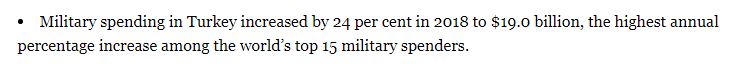 «Μόνο το 2018 οι δαπάνες τις Τουρκίας αυξήθηκαν κατά 24%, που είναι η μεγαλύτερη αύξηση στρατιωτικών δαπανών μεταξύ των 15 χωρών με τις μεγαλύτερες στρατιωτικές δαπάνες».
