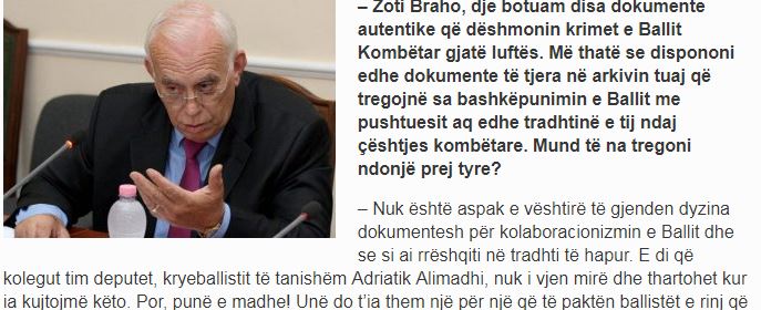Οι σημερινοί οπαδοί της Μπαλί Κομπετάρ αλλά και οι ιστορικοί αυτής της οργάνωσης υποτιμούν ή προσποιούνται ότι ξεχνούν αυτές τις συμφωνίες, ενθαρρυνόμενοι από τον πρωθυπουργό Έντι Ράμα, ο οποίος τίμησε τον αρχισυνεργάτη (των κατακτητών) Μιδάτ Φράσερι, καθώς ειπώθηκε ότι ο ηγέτης της Μπαλί Κομπετάρ δεν συνεργάστηκε με τους εισβολείς και όλα όσα λέγονται είναι συκοφαντίες. Αποδέχεστε αυτή τη λογική;