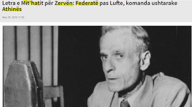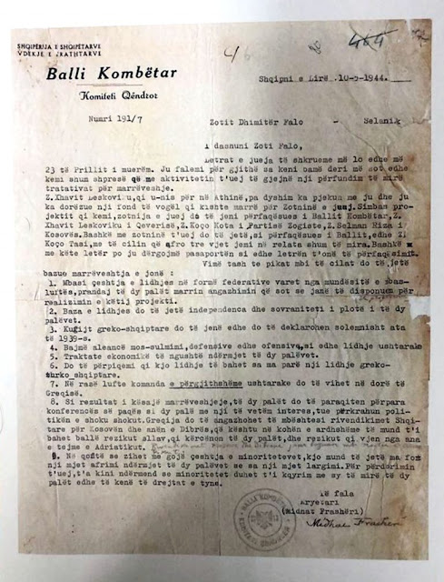 Είναι μια επιστολή που ο Μιδάτ Φράσερι στέλνει στο εθνικιστικό κόμμα του Ναπολέοντα Ζέρβα στην Ελλάδα το Μάιο του 1944.