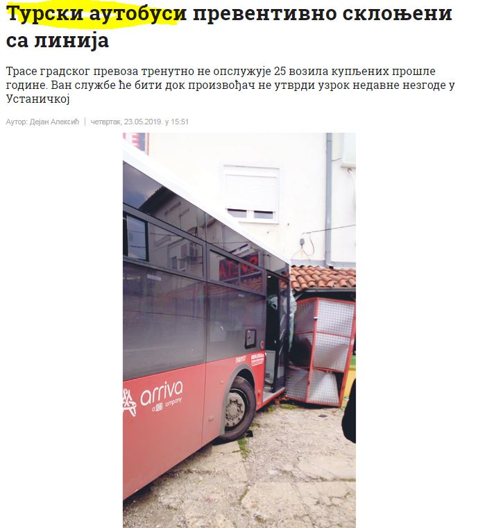 «Ως υπεύθυνη εταιρεία, η ασφάλεια των επιβατών είναι υψίστης σημασίας για εμάς, και τα 25 λεωφορεία προληπτικά αποσύρονται από την κυκλοφορία, μέχρι να λάβουμε την διαβεβαίωση από την κατασκευάστρια εταιρεία ότι παρέχουν πλήρη ασφάλεια», δήλωσε ηγετικό μέλος της Κοινοπραξίας ‘Arivi’ που εξυπηρετεί 43 γραμμές στη σερβική πρωτεύουσα.
