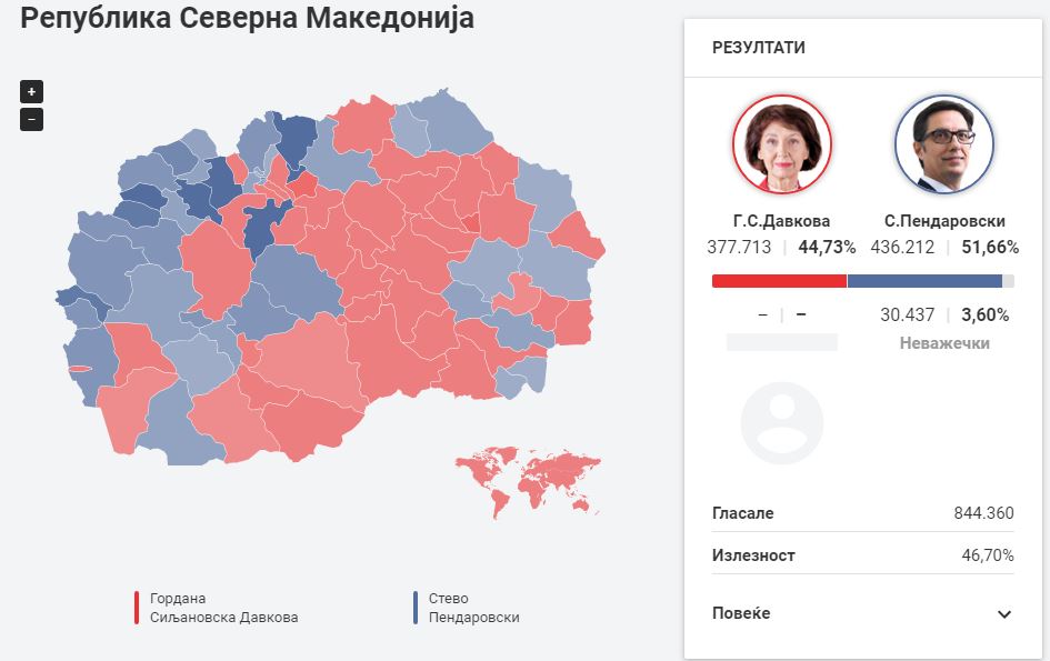 Η αντίπαλός του, Γκορντάνα Σιλιάνοφσκα Ντάβκοβα, με την υποστήριξη του VMRO-DPMNE και του συνασπισμού του, κέρδισε 377.713 ψήφους ή 44,73%. Η προσέλευση ήταν 46,70%.