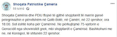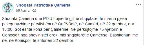 Υπενθυμίζουμε την 75η επέτειο της γενοκτονίας από τους Έλληνες σοβινιστές κατά των Αλβανοτσάμηδων. Ελάτε μαζί μας στην Κονίσπολη το Σάββατο 22 Ιουνίου», όπως σημειώνεται χαρακτηριστικά με φωτό την πορεία προς τα ελληνικά σύνορα.