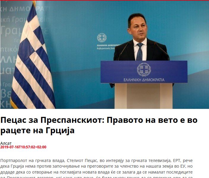 «Ο εκπρόσωπος της ελληνικής κυβέρνησης, Στέλιος Πέτσας, σε συνέντευξή του στην ελληνική τηλεόραση ΕΡΤ, δήλωσε ότι η Ελλάδα δεν αντιτίθεται στην έναρξη των συνομιλιών για την ένταξη της χώρας μας στην ΕΕ, αλλά πρόσθεσε ότι με το άνοιγμα η νέα κυβέρνηση θα προσπαθήσει να μειώσει τις συνέπειες της Συμφωνίας των Πρεσπών, η οποία, όπως είπε, θα είναι πολύ δύσκολο να αλλάξει ή να ακυρωθεί. Η δύσκολη μάχη θα είναι σε εξέλιξη κατά τη διάρκεια των διαπραγματεύσεων, τόνισε ο Πέτσας», σημειώνει το δημοσίευμα.